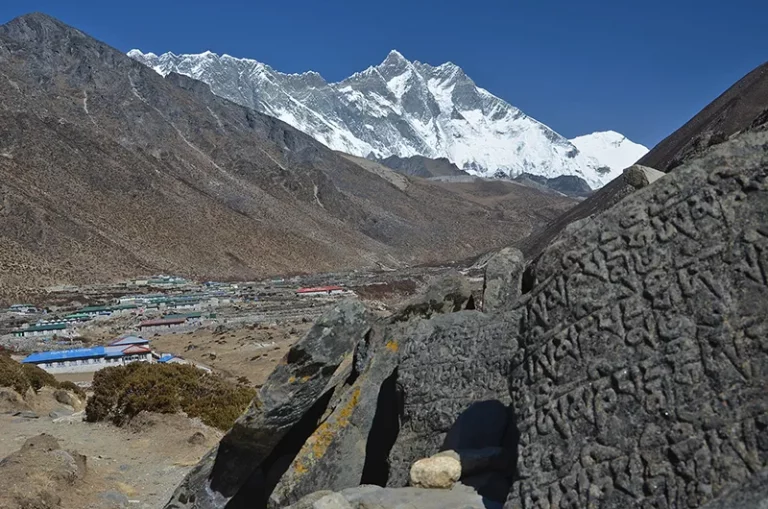 In Dingboche bietet sich noch einmal die Möglichkeit die letzte warme Dusche vor dem großen Abenteuer Island Peak zu nehmen. Tibetische Händler kommen hier häufig vorbei und bieten ihre Waren an. Es geht in leichter Steigung empor. Durch das Tal führt ein verhältnismäßig kleiner Gletscherbach trotz großem Einzugsgebiet. Die Pflanzendecke besteht aus niedrigem Gebüsch, Wacholder, eine Art Berberitze und dem Seabuckthorn-Busch mit seinen kleinen orangen Früchten, aus denen ein Saft gewonnen wird. Der Saft ist sehr vitaminreich, aber teuer, doch zumindest nichts Künstliches und eine bescheidene Einkommensquelle für die Menschen hier. Die Landschaft ist wild und lieblich zugleich. Links überragt der Lhotse das Tal, rechts der schöne Ama Dablam und vor einem nun immer besser sichtbar wie ein vergletscherter Bergrücken zwischen den weißen Riesen, der 6178 m hohe Island Peak. In Chuhkung kann man sich nochmals wohlfühlen. Die Spätnachmittagsstimmung auf den Terrassen der Lodges erinnert an Berghütten in den Alpen.