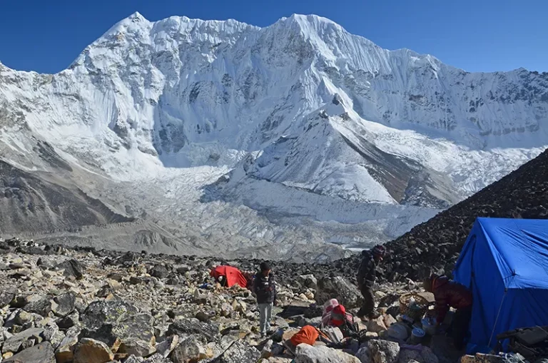Es geht in leichter Steigung empor, zuerst auf der Krume einer Gletschermoräne. Dann führt der Weg weiter in einem weiten Tal mit einem Gebirgsfluss. Hier weiden Yaks. Schließlich geht es neben der Moräne des Imja Gletschersees weiter. Den dahintergelegenen See kann man nur ahnen. Felsen, Sand und Steine und das wenige Gras, alles schimmert hier wie von Silber überzogen. Am Basecamp stehen einige Zelte. Drei einfache Toiletten sollen den Platz sauber halten. Ein kurzer Aufstieg auf die Moräne neben dem Zeltplatz ermöglicht den Blick auf den riesigen Gletschersee gleich neben dem Camp.