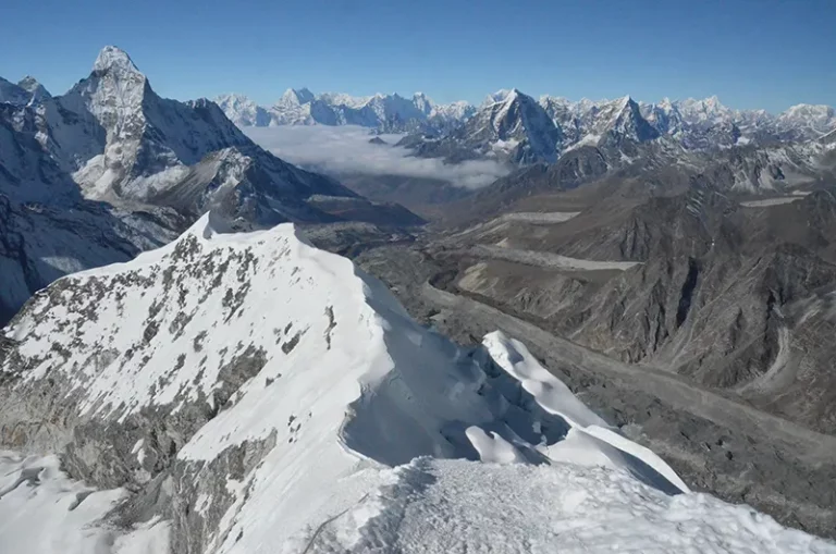 Der Island Peak (Imja Tse) liegt zwischen der gewaltigen Lhotse-Südwand und dem Ama Dablam. Der Berg wurde von Eric Shipton Island Peak genannt, da der Gipfel wie eine Insel aus der ihn umgebenden Eiswüste heraussticht. 1983 wurde er in Imja Tse umbenannt, umgangssprachlich wurde jedoch weiter der Name Island Peak genutzt. Die Erstbesteigung fand 1956 durch ein Schweizer Bergsteigerteam als ein Training für die Besteigung des Mount Everest und Lhotse statt.